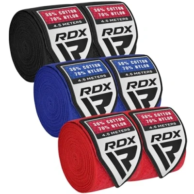 EXTENDED 4.5M LENGTH FOR ENHANCED SUPPORT– Tired of wraps that barely cover your hands? The RDX boxing wraps feature an extended 4.5M (180 inches) length so you can wrap your fists tight, lock your fingers and stabilize your wrists, all with one powerful wrap. This extended length allows for multiple layers of cushioning that helps disperse heavy impacts evenly across your hands. Whether you’re throwing jabs in boxing or combos in MMA, go all-in knowing the RDX Muay Thai wraps have your back! QUICK EZ HOOK-AND-LOOP STRAP FOR EFFORTLESS FIT– Are you tired of wraps that come loose mid-session? The RDX inner glove wrap pair features a Quick-EZ Hook-and-Loop closure system that lets you secure these wraps quickly and easily. This durable closure system locks your MMA wraps firmly in place so they never distract you by coming loose during training. These wraps are available in a variety of exciting colors and also come as a pack of three pairs! BREATHABLE FABRIC FOR COMFORTABLE TRAINING– Are sweaty hands making you uncomfortable? The RDX boxing hand wraps are crafted from a sweat wicking cotton-nylon blend, designed to keep sweat away keeping your hands fresh during your most intense workouts. This fabric also features fast-drying that prevents your boxing quick wraps from getting soaked. No sweat! No distractions! Just a comfortable experience that makes each session more productive! SEMI-ELASTICATED WRAPS FOR PERFECT COMPRESSION SUPPORT– Do your wraps feel too tight or too loose? The RDX MMA hand wraps solve that with a flexible cotton-nylon blend that delivers consistent and balanced compression support across your hands. This semi-elasticated fabric wraps your hand into one solid unit, prevents the hand wraps from bunching and fills any extra glove space for a nice, tight fit. No more loose boxing hand wraps! just locked-in support built for power and precision! ROBUST THUMB LOOP FOR QUICK AND EASY APPLICATION– Frustrated by a wrap that won’t stay put, forcing you to re-wrap? The RDX MMA wraps feature a robust thumb loop that simplifies the whole wrapping process. Start by inserting your thumb into the loop and continue wrapping steadily in one seamless motion. Whether you are a pro or a beginner, this innovative design ensures that every wrap is quick and precise. With wrist wraps that can be wrapped instantly you can spend more time honing your skills TARGETED SUPPORT FOR ALL COMBAT SPORTS– Want precise hand support for each combat sport? The RDX Mexican style hand wraps are engineered to give you targeted support exactly where you need it! Add extra padding to your fists and wrists for powerful punches in boxing or wrap around the back of your palm and thumb for strikes in Muay-Thai. For kickboxing, wrap your wrist for rapid combos and beyond hands, use them for customized ankle support instead of loose socks. One RDX wrap! Multiple sports!