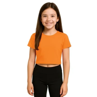 Girls Crop Tops in Fun Colors: Trendy girls' t-shirts in red, pink, neon, green, black, white, and orange. Made from soft stretch cotton, perfect for dance, P.E., casual outfits, or summer layering with everyday style. Easy to wear & wash. Girls' T-Shirts With a Twist: Upgrade basic girls' t-shirts with this stylish cropped version. Features include crew neckline, comfy cotton fabric, and bold shades like red crop top kids, pink tshirt girls, and green top girls for everyday outfits. Age-Perfect Fit for 5–14 Years: Sized just right for girls crop tops ages 5-13. Whether they want a classic white tee or an eye-catching neon tshirt for girls, these tops are perfect for school, holidays, and layered streetwear. Made for Active Kids: This kids crop top is loved & worn for gymnastics, P.E., and everyday play. Choose from popular styles like neon tops for girls, kids black top, and white crop top for girls. A Stretchy fit makes movement easy and comfortable. Easy to wear, Easy to Wash - These crop tops for girls feature a snug fit and vivid tones like girls red crop top and pink top kids. Ideal for summer, dance, or casual lounge wear in every season.