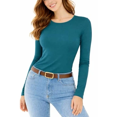 Re Tech UK Ladies Long Sleeve Tops for Women Basic Round Neck Soft Stretch Fitted Top Plus Size Black White & More Colours Great Womens T Shirts, Teal, SM