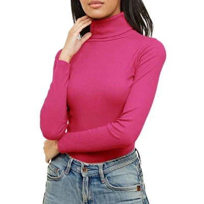 Re Tech UK Ladies Plain Ribbed Cotton Polo Turtle Roll Neck Tunic Top Jumper Full Sleeve, Hot Pink, M/L 12 14