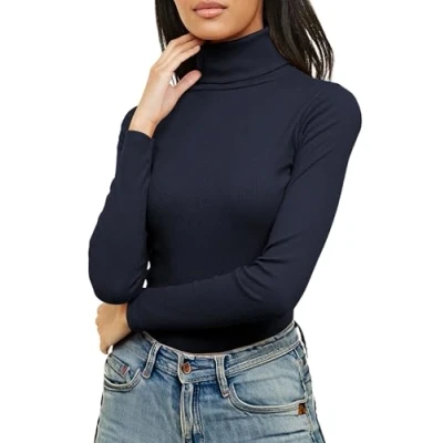 Re Tech UK Ladies Plain Ribbed Cotton Polo Turtle Roll Neck Tunic Top Jumper Full Sleeve, Navy Blue, S/M 8 10