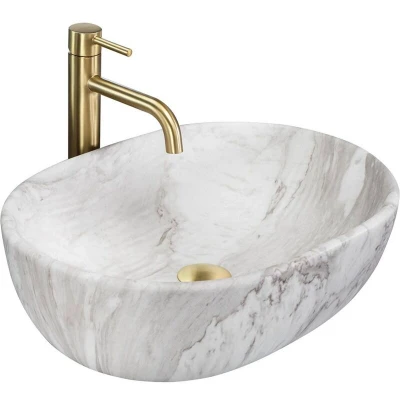 General description The Rea Amelia washbasin is designed for fans of timeless shapes with a modern twist. It seamlessly fits into both minimalist-style bathrooms and classic bedrooms. Technical specifications Width: 345 mm Height: 135 mm Depth: 105 mm Length: 480 mm Color: Stone Look Material: Sanitary Ceramic Finish: Matte Shape: Oval Overflow Hole: 0 Tap hole: 0 Installation Mounting Method: To pose