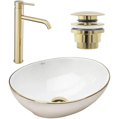 REA Set Countertop washbasin Sofiagold edge + Bathroom faucet Lungo gold Plug uniwersalny
