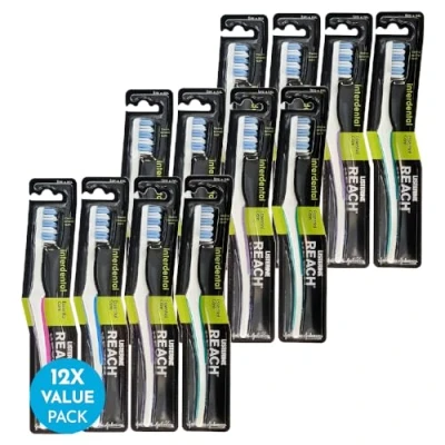 REACH Essential Care Interdental Firm Toothbrush, Single Pack x 12, Full Head Hard Bristle Manual Toothbrushes, Variety Colors Multipack, Daily Oral Enamel Dental