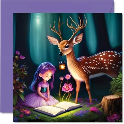 MAKE THEM SMILE WITH THIS BIRTHDAY CARD: This exceptional quality birthday card for her shows the design of a girl reading a book in an enchanted forest with a deer. If you are looking for thoughtful birthday cards for girls, then this happy birthday card is bound to make them smile. Not just for her birthday this could also be for a Best Friend, Mother, Daughter, Grandaughter, Fiance, Partner, Girlfriend, Wife, Grandmother, Sister, Auntie, Niece or Cousin. WHAT DO YOU GET: The card is printed on one side and BLANK ON THE INSIDE to allow you to write your very own message. The unique fun design is printed on a specially sourced and environmentally responsible board. At 360 microns thick the natural white one-sided gloss board has a quality look and feel. Supplied with a coloured gummed envelope to complement the design and ready to be sealed and sent in the post. NO INK SMUDGES: There is nothing worse than writing inside a card to find that the shiny surface makes the ink smudge. This is why we use a high quality one sided coated board. The uncoated side will absorb more of the ink from your pen to make smudging a thing of the past. Reading birthday cards, book lover birthday card. SIZES: Greeting Card = 145mm x 145mm, Envelope = 155mm x 155mm, Card Thickness = 360 micron. Wife birthday cards, girlfriend birthday cards, happy birthday friend cards, granddaughter birthday cards, daughter birthday cards, sister birthday cards, birthday card books, reading birthday card. MADE AND QUALITY CHECKED IN THE UK: We print and manufacture all our product right her in the UK so you can be sure of a fast turnaround and a product that is expertly made. Using environmentally responsible premium board our card is conscious of the responsible management of the world's forests - birthday cards for women, birthday cards for girls, magical birthday cards, reading birthday card, book birthday card.