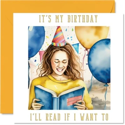 MAKE THEM SMILE WITH THIS BIRTHDAY CARD: This exceptional quality birthday card for her shows the design of a party girl reading a book on her birthday with the words 'It's my birthday I'll read if I want to'. If you are looking for thoughtful birthday cards for women, then this happy birthday card is bound to make them smile. This could also be for a Best Friend, Mother, Daughter, Grandaughter, Fiance, Partner, Girlfriend, Wife, Grandmother, Sister, Auntie, Niece or Cousin. WHAT DO YOU GET: The card is printed on one side and BLANK ON THE INSIDE to allow you to write your very own message. The unique fun design is printed on a specially sourced and environmentally responsible board. At 360 microns thick the natural white one-sided gloss board has a quality look and feel. Supplied with a coloured gummed envelope to complement the design and ready to be sealed and sent in the post. NO INK SMUDGES: There is nothing worse than writing inside a card to find that the shiny surface makes the ink smudge. This is why we use a high quality one sided coated board. The uncoated side will absorb more of the ink from your pen to make smudging a thing of the past. Reading birthday cards, book lover birthday card. SIZES: Greeting Card = 145mm x 145mm, Envelope = 155mm x 155mm, Card Thickness = 360 micron. Wife birthday cards, girlfriend birthday cards, happy birthday fiance cards, best friend birthday cards, sister birthday cards, daughter birthday cards, grandaughter birthday cards, friend birthday cards, birthday card books, reading birthday card. MADE AND QUALITY CHECKED IN THE UK: We print and manufacture all our product right her in the UK so you can be sure of a fast turnaround and a product that is expertly made. Using environmentally responsible premium board our card is conscious of the responsible management of the world's forests - birthday cards for women, birthday cards for girls, book birthday cards, reading birthday card, love to read birthday card.