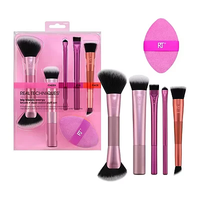 Real Techniques Big Blends Energy Brush + Dual Sided Puff, 6 Piece Kit for Powder, Cream & Liquid Application, Precision Tools Contour, Blending Finishing, Vegan Cruelty Free