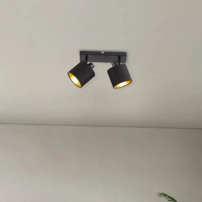 AmazonTommy 2-Bulb Spotlight Bar in Matt Black with Fabric Shades in Black/Gold Light bulbs not included. Matching light bulbs 2 x E14 max. 28 watts The light has a width of 28 cm The spotlights can be rotated and pivoted so that the light can be used in many ways Bulb not included