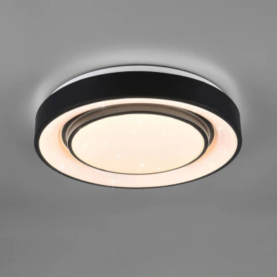 Round LED ceiling light Mona with infinitely adjustable light colour and multicolour function The Mona LED ceiling light is visually divided into two light sources - a slightly protruding inner circle and an outer ring, each surrounded by a surrounding black frame made of metal. The matt plastic diffuser provides a starlight effect for certain something to bring the luminaire into focus. The variable lighting, which is created by RGBW colour change, adjustable colour temperature, memory function, night light and dimmability, leaves nothing to be desired. Thus, the luminaire provides optimal lighting conditions, a pleasant atmosphere and can be integrated into numerous modern furnishing concepts. Technical details / compatibility - Controllable via the WiZ app (available free of charge for iOS and Android) or WiZ remote control (see accessories). - Voice control possible, compatibility with Amazon Alexa, Google Home and Siri Shortcuts - Colour selection from 16 million colours as well as various white tones (64,000 shades of white) possible - Creation of lighting schedules, scenes and groups - Dimming without additional installation - No bridge or hub required, integration via WLAN (with Internet connection remote access via encrypted cloud connection)