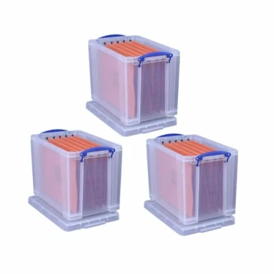 These Really Useful Boxes are transparent, solid plastic boxes for multi-purpose storage with 10 A4 suspension files Made from sturdy polypropylene, these 19 litre storage boxes are extremely durable, and transparent to allow easy identification of contents With moulded suspension ridges for holding suspension files, these boxes can be used to store and organise A4 documents, and are perfect for home and office suspension filing These boxes can be easily stacked on top of each other, offering a handy space-saving option The 19 litre Really Useful Box with A4 suspension files is ideal for every home and office use