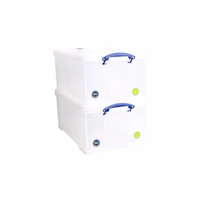 "This pack of 2 Really Useful boxes have a 64 litre capacity and are transparent, solid plastic boxes for multi-purpose storage" Each 64 litre Really Useful box comes with a lid and clip lock handles to keep its contents secure "Use as a car boot box and for storing a range of items such as office supplies, A4 and foolscap files, office supplies, school stationery, crafts materials and many more" "Made from sturdy polypropylene, each box is extremely durable, and transparent to allow easy identification of contents" "These boxes can be easily stacked on top of each other, offering a handy space-saving option"