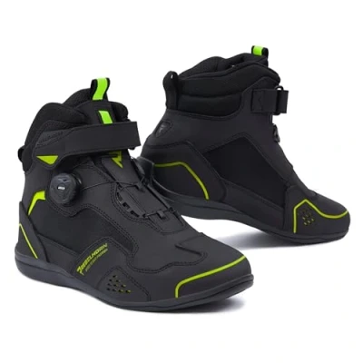 REBELHORN Spark II Motorcycle Boots for Men and Women, PU Leather, ATOP Quick Lacing System, Ankle Protectors, Reinforced Toes, Mesh Ventilation Panels, Sizes up to 48, Black fluo yellow, 10 UK