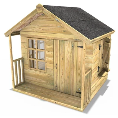 Designed to inspire your child's imagination, this larger Rebo Playhouse is the perfect space to unleash their creativity, helping them create a world full of fun and adventure. With its bigger perspex windows and built-in veranda, this charming 5FT x 5FT playhouse offers even more room to play. Packed with delightful details that add a touch of magic, this playhouse features a shuttered window with a shop shelf, alongside two standard windows. This shop version is sure to spark hours of imaginative play and make-believe fun. Crafted from pressure-treated timber, our playhouses are built to last. The strong supports and 11.5mm tongue-and-groove construction ensure a sturdy, durable playhouse that will be a beautiful addition to any outdoor space. For quicker assembly, the front, back, and side panels come pre-assembled. Please note, door furniture may differ slightly from what is shown in the images. Explore our full range of kids wooden playhouses to find the perfect outdoor toys for