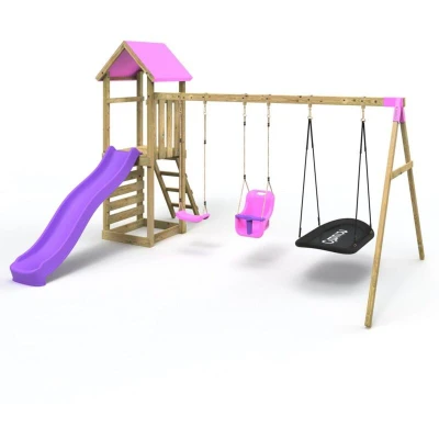 General description Rebo has expanded its popular wooden playset range with the new Rebo Adventure Wooden Climbing Frame, Swing Set, and Slide - Snowdon Pink. Designed and made in the UK, this robust adventure playset will be an exciting addition to any garden, keeping little explorers entertained for hours. Made from pressure-treated timber, these sturdy climbing frames are built to last, providing children with a way to stay fit and healthy while sparking their imaginations and helping them burn off excess energy. Technical specifications Material: Pressure-treated timber Slide height: 8ft Slide material: Durable injection-moulded plastic Installation Tools required: Drill Wood is not pre-drilled; full instructions are provided Canvas needs to be cut to size for the roof as part of the assembly