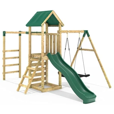 🟢 PACKED WITH FUN FEATURES - 8ft Injection-Moulded Plastic Slide turns into a fun Wavy Water Slide with just a few simple modifications. Get monkeying around, with the metal hanging monkey bars! Perfect for muscle development and hand-eye coordination 🟢 SWING AND CLIMBING WALL - Large Boat Swing allows children to swing in comfort and style! Wooden climbing wall with colourful climbing stones - perfect for developing hand-eye coordination and problem solving skills 🟢 WEATHER-RESISTANT - Tarpaulin roof is designed to withstand all weather conditions. Space beneath tower platorm is absolutely ideal for use as a sandpit, ballpool or even toy storage 🟢 ADJUSTABLE ACCESSORIES - Height of accessories is adjustable, allowing you to choose the right positioning for your child. Constructed of pine wood, this sturdy playset is built to last 🟢 DURABLE PRODUCT - Pressure treated timber for a durable and weather-resistant product - ideal for use in gardens and other outdoor environments. Assembly required - full instructions included