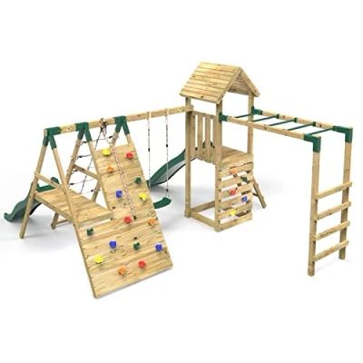 🟢 PACKED WITH FUN FEATURES - 6ft and 8ft Injection-Moulded Plastic Slides turn into fun Wavy Water Slides with just a few simple modifications. Kids who love a challenge will relish the task of beating the up-and-over climbing wall 🟢 LET'S GET CLIMBING - Wooden climbing wall with colourful climbing stones - perfect for developing hand-eye coordination and problem solving skills. Cargo Net at rear provides variety and adds an alternative method of ascension 🟢 BUILT TO LAST - Constructed of pine wood, this sturdy playset is built to last. The upgraded wooden roof on this playset is a nice added touch that gives it even more character 🟢 WEATHER-RESISTANT - Pressure treated timber for a durable and weather-resistant product - ideal for use in gardens and other outdoor environments. Height of accessories is adjustable, allowing you to choose the right positioning for your child 🟢 VERSATILE SPACE UNDER PLAYSET - Space beneath tower platorm is absolutely ideal for use as a sandpit, ballpool or even toy storage. Get monkeying around, with the metal hanging monkey bars! Perfect for muscle development and hand-eye coordination