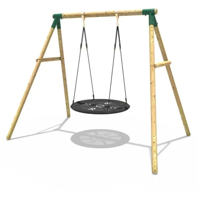 General description This Rebo Wooden Garden Swing Set features a large round net swing seat in a stylish Mercury Green color. Constructed from natural wood, it is designed for durability and strength, making it a perfect addition to your outdoor play area. Technical specifications Material: Pressure treated timber Top beam dimensions: 90mm Leg dimensions: 70mm Installation Tools required: Drill Usage Recommended supervision for small children while using the swing set Ensure a safety perimeter around the play equipment Other information Natural wood may split or crack, which is normal and does not affect the strength or durability of the product