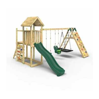 General description This extended deck adds extra room as well as fun to the standard Rebo climbing frame tower. Double width, it features both a wooden ladder and climbing wall for accessing the deck, which comes with an upgraded wooden roof as standard. The fun continues with an 8ft (2.20m) injection moulded slide that includes a built-in waterslide feature, along with various swing arm options. This model also includes an up and over climbing wall and a second slide at the end of the swing arm, equipped with colorful climbing rocks on one side and a cargo net on the other. Designed and made in the UK from pressure-treated timber, these sturdy climbing frames are built to last and inspire countless backyard adventures for years to come. Technical specifications Extended deck for additional play area 8ft (2.20m) injection moulded slide Pressure-treated timber construction Installation Tools required for assembly include a drill Wood is not pre-drilled Full instructions are provided