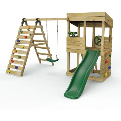 This new Rebo Lookout Tower - Crest is the perfect addition to any garden. Compact enough to fit neatly into a corner, yet packed with features to spark imagination and encourage active play, it’s designed to keep kids entertained for hours. Built from pressure-treated timber, the tower includes a durable 6ft injection-moulded slide for fast, fun escapes. It also comes with the Adventure Pack included, adding even more excitement to outdoor play. The set features a single swing arm with a child seat and climbing wall, offering a variety of play options to suit every child’s interests. A sturdy ladder provides easy access to the tower, and handles at the top of the climbing wall add extra safety and confidence while climbing. For added customisation, an optional Den Pack is available, letting you transform the tower into a unique play centre full of possibilities. Please note: Tools including a drill, are required for assembly. The wood is not pre-drilled, but full instructions are
