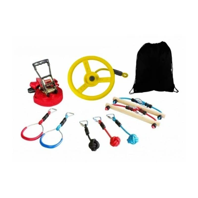 General description Rebo Ninja Line is an exciting garden obstacle course designed for active kids who enjoy challenges. It can be easily set up between two trees, creating a fun adventure course to keep children entertained. The set includes a Ninja line ratchet strap for attaching various fun accessories, allowing for customizable layouts for the ultimate ninja challenge.