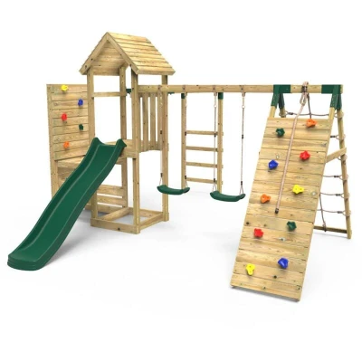General description This Rebo Wooden Climbing Frame is designed for adventure and fun, featuring a vertical rock wall, swing set, and slide. Made from pressure-treated timber, this sturdy climbing frame is built to last, providing years of joy while promoting fitness and healthy play for children. The climbing tower includes a vertical rock climbing wall and a wooden ladder leading to an 8ft slide made from durable injection-moulded plastic. The Rebo range offers various swing configurations to suit your family's needs. Technical specifications Material: Pressure-treated timber Slide height: 8ft Slide material: Durable injection-moulded plastic Installation Tools required: Drill Wood is not pre-drilled; full instructions are provided Canvas must be cut to size for the roof during assembly