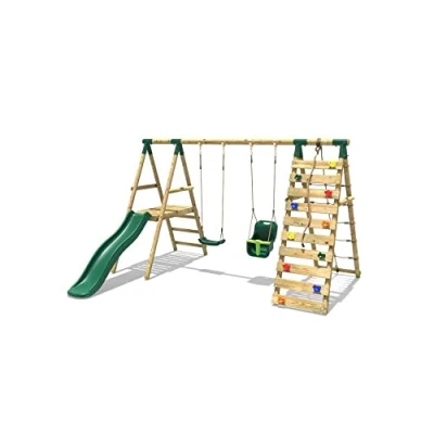 🟢 WEATHER-RESISTANT - Pressure treated timber for a resiliant and weather-resistant playset that can stand up to the wear and tear of play time 🟢 LET'S GET CLIMBING! - Climbing wall with colourful climbing holds and climbing rope, plus cargo net at rear. Perfect for developing physical development and hand-eye coordination in children 🟢 FUN WAVY SLIDE - 6ft injection-moulded plastic slide turns into a fun wavy waterslide with just a few simple modifications (hose attachment not included) 🟢 STURDY SWING ARM - Baby swing and standard swing come with soft-feel ropes to ensure a comfortable grip with minimal friction. Height of swings is adjustable, allowing you to choose the right positioning for your child 🟢 MARKET LEADERS - Rebo are market leaders at producing high-quality outdoor kids' play equipment including wooden swings and climbing frames for the garden