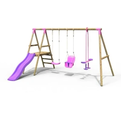 💗 WEATHER-RESISTANT - Pressure treated timber for a resiliant and weather-resistant playset that can stand up to the wear and tear of play time 💗 STURDY SWING ARM - Baby swing and standard swing come with soft-feel ropes to ensure a comfortable grip with minimal friction. Glider also included. Height of swing is adjustable, allowing you to choose the right positioning for your child 💗 FUN WAVY SLIDE - 6ft injection-moulded plastic slide turns into a fun wavy waterslide with just a few simple modifications (hose attachment not included) 💗 ROBUST WOODEN CONSTRUCTION - Constructed of pine wood, this sturdy playset is built to last. Brackets are powder-coated for added durability 💗 MARKET LEADERS - Rebo are market leaders at producing high-quality outdoor kids' play equipment including wooden swings and climbing frames for the garden