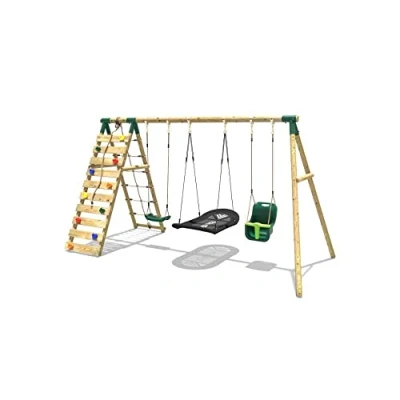 🟢 WEATHER-RESISTANT - Pressure treated timber for a resiliant and weather-resistant playset that can stand up to the wear and tear of play time 🟢 LET'S GET CLIMBING! - Climbing wall with colourful climbing holds and climbing rope, plus cargo net at rear. Perfect for developing physical development and hand-eye coordination in children 🟢 ROBUST WOODEN CONSTRUCTION - Constructed of pine wood, this sturdy playset is built to last. Brackets are powder-coated for added durability 🟢 STURDY SWING ARM - Boat swing, baby swing and standard swing come with soft-feel ropes to ensure a comfortable grip with minimal friction. Height of swing is adjustable, allowing you to choose the right positioning for your children 🟢 MARKET LEADERS - Rebo are market leaders at producing high-quality outdoor kids' play equipment including wooden swings and climbing frames for the garden
