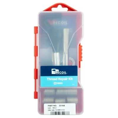 General description Recoil 35168 Metric Thread Repair Kit is designed for repairing damaged threads or creating stronger original threads in alloys and composite materials. This kit is particularly useful in original equipment manufacturing and allows for a seamless changeover between unified and metric threads. Technical specifications Thread size: M16.0 Pitch: 2.00 Insert length: 16mm Insert length ratio: 1 1/2D Material: Corrosion-resistant stainless steel Compatibility and accessories Includes quality HSS tap Includes installation tool Includes precision stainless steel inserts Includes instructions Supplied in a sturdy container