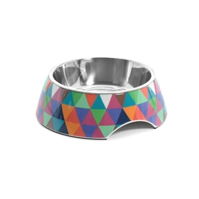 Record Crystal Dog Bowl Stainless Steel and Melamine Equipped with Non Slip Rubber Pads Size Ø 17.5 cm Capacity 350 ml Geometric Pattern Multicolour Triangles