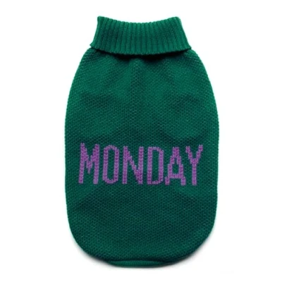 Record Dog Sweater Everyday Soft High Neck with Elasticated Waistband, Embroidered 'Monday' Green, M Back Length 40cm