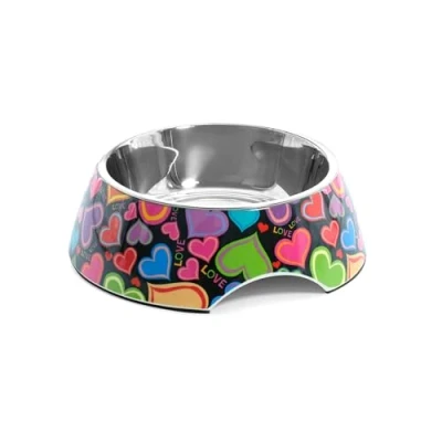 Record Lovely Bowl for Dogs and Cats Stainless Steel Melamine Equipped with Non Slip Rubber Pads Dimensions: Diameter 17.5 cm Capacity 350 ml Multi Coloured Hearts Design