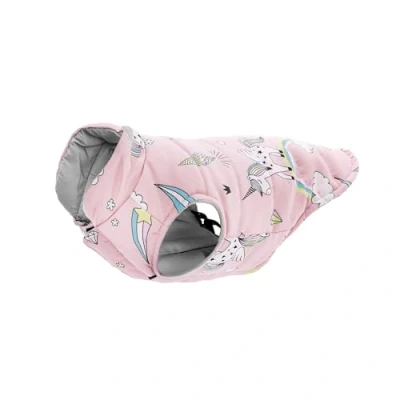 UNIQUE DESIGN: The dog coat features unique unicorn pattern and a choice of light blue and pastel pink, giving your dog an adorable and original style during every walk. PRACTICAL: Equipped with a convenient hole in the back, this coat allows you to easily attach the leash to the collar or harness, offering maximum convenience during outings. COMFORTABLE: Adjustable elastic bands for the back legs ensure that the coat stays well positioned even during movements, ensuring stability and comfort for your dog. VELCRO CLOSURE: Adjustable Velcro closure makes the coat easy to wear and adjust, ensuring a secure and comfortable fit for dogs of different sizes. Measurements: The Unicorn waterproof coat is available in pink and in sizes with back length of 15 cm, chest circumference of 26 -28 cm and neck circumference of 16-18 cm. Perfect for small dogs.