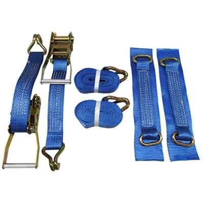 General description Recovery Ratchet Strap Set designed for securing vehicles to trailers, featuring oval links and a padded back to prevent damage to alloy wheels. This kit includes everything needed for effective vehicle recovery. Technical specifications Webbing Width: 50MM (2 Inch) Overall Length: 4 Metres Minimum Breaking Load: 5 Ton (5000 KGS) Safety Factor: 2:1 Material: 100% Polyester Compatibility and accessories Kit includes 2 Ratchet Handles 2 Long Ends with Claw Hooks 2 Oval Link Straps Usage Ideal for various recovery services Designed to securely fasten vehicles to trailers