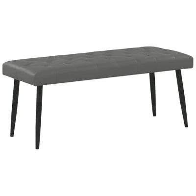 General description A decorative bench that beautifully complements any bedroom. It fills empty space near your bed effortlessly and serves as a useful accessory for sitting or storing items you may need at hand. The buttoned faux leather upholstery enhances its elegant character and adds charming appeal, while the metal legs ensure stability and durability. Technical specifications Product Type: Bed Bench Style: Traditional General Color: Grey Main Material: Faux Leather Additional Material: Metal Seat Material: Fabric Material Composition: 100% Polyester Shape: Rectangular Dimensions: Depth: 43 cm, Width: 104 cm, Height: 45 cm, Seat Thickness: 10 cm, Seating Surface: 104x43 cm Weight: 7 kg Weight Capacity: 135 kg Installation Assembly Information: Legs to be fitted Estimated Assembly Time: 5-15 minutes Usage Firm and comfortable seating Well-suited for a variety of home decor styles Elegant design with various arrangement possibilities Other information Maintenance tips for Faux