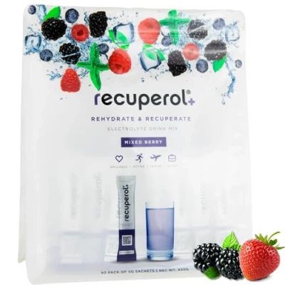 Exercise, Partying, General Hydration, Hot Weather & Travel - Recuperol is an amazingly versatile electrolyte & vitamin supplement, specially formulated to help you Rehydrate & Recuperate. Whether you’re trying to increase your water intake, optimise performance for sport & exercise or recover after a big night out - our great-tasting and rapid-dissolving drink is for you! Formulated to World Health Organisation standards - Based on the WHO formula for oral rehydration salts, recuperol helps your body uptake water as quickly as possible and can replenish electrolytes (mineral salts) you've lost through sweating, diarrhoea and vomiting. Enables Rapid Recovery - Electrolytes are key for performance but are just as important for recovery. Recuperol is a faster and more effective alternative to electrolyte tablets, has a high electrolyte content, and contains Zinc, Vitamin C, Vitamin B12, Vitamin D3 & Potassium - helping support immune function, prevent muscle cramps and eliminate headaches caused by dehydration. Low-Calorie Hydration - Recuperol only contains (14kcal) per sachet and is suitable for Vegans. Unlike most competitors - we’re GMO-Free, Gluten-Free and have NO Artificial Colours, Flavours or Preservatives. Smaller & Lighter Packaging - Our BIG VALUE 90 sachet pouch makes the perfect gift to help friends and family feel their best. DIRECTIONS: After a big night out, consume 2 sachets with 400ml of water before bed and repeat when you wake up. For all other uses, mix 1 sachet per 200ml-500ml of water & enjoy! *Packaging may vary