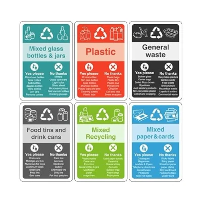 Complete pack of 6 essential recycling signs (General waste,Plastic, Mixed bottles & Jars, Food tins and drinks, Mixed paper and card, Mixed recycling). High-tack self-adhesive vinyl offers the optimal solution for indoor signage. Its easy application—simply peel off the backing and fix to your chosen location—makes it ideal for non-porous, flat, uneven, or curved surfaces Measuring 300mm x 200mm, our sign ensures optimal visibility when mounted at eye level for viewing within 7 meters, effectively enhancing safety and communication on the road network This sign conforms to EN ISO 7010:2012 standards, featuring a centrally positioned black pictogram or text against a contrasting background, ensuring clear communication and adherence to safety regulations Experience peace of mind with our comprehensive 4-year warranty indoor signage. We stand by our commitment to quality, ensuring durability and reliability for every product