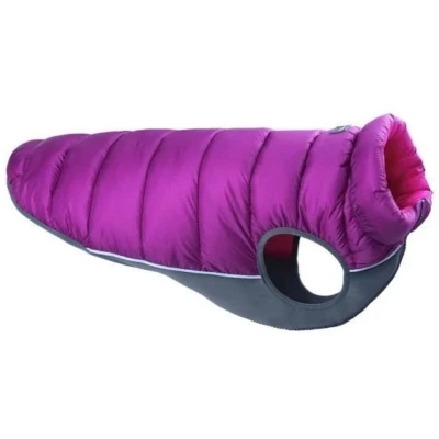 Reversible dog jacket, 25 cm, made of neoprene and fleece. Waterproof and warm, it protects against snow and water. Available in pink and purple, with a double-sided zipper for a comfortable fit.