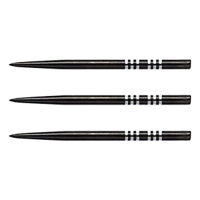 Black Long Re-grooved points 41mm long 3 sets of points per pack Medium friction coating with machined grooves for maximum finger grip When inserted into the dart, between 5mm and 6mm of each point enters into the barrel of the dart. Therefore, a 32mm point will only show 26mm or 27mm of the actual point