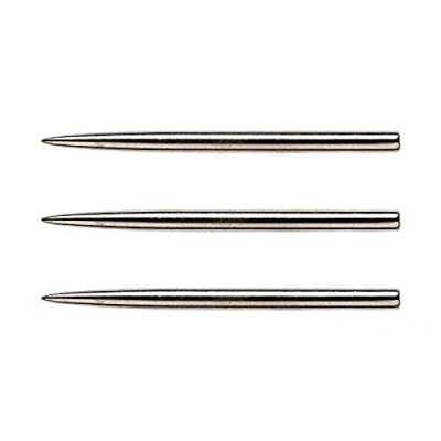 Silver Effect Standard points 32mm long 3 sets of points per pack Smooth coating for easy penetration into the dartboard When inserted into the dart, between 5mm and 6mm of each point enters into the barrel of the dart. Therefore, a 32mm point will only show 26mm or 27mm of the actual point