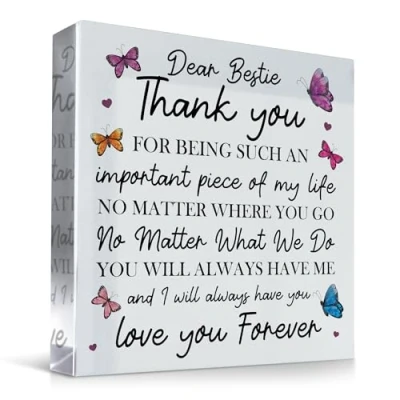 Check out this beautiful acrylic plaque which would be a brilliant gift for your Best Friend for their Birthday, Christmas or just to say Thank you! Suitable For: Best Friend Gifts, Birthday Gift, Bestie Gifts, Gift For Bestie, Bestie Gift Christmas, Gift From Friend, Friendship Gift, Thank You Gift, Best Friend Plaque Beautiful handmade plaque, crafted individually and printed professionally. The design is unique and made in house, you will only find this great gift from Red Ocean Gifts. We take pride if ensuring you have the best gift to give! Plaque Size: 100x100 mm (10 x 10 cm). Our plaques are made out high quality clear acrylic and is printed on. The plaque will last a lifetime and be loved forever! Each Red Ocean Sign is Handmade in England by our team of skilled gift makers, who pay attention to every last detail, ensuring that the gift you choose will amaze the recipient. Supplied ready to gift!