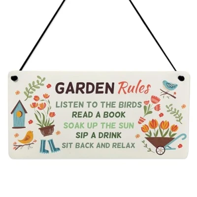 Check out this beautiful acrylic plaque which is printed with Garden rules. This sign will be the perfect decor piece to hang in your home or outside in the Garden! Suitable For: Garden Rules Sign, Garden Sign, Shed Sign, Garden Plaque, Garden Accessories, Summer House Signs, Welcome Signs For Garden, Garden Shed Sign, Garden Signs For Outdoor, Gardener Gifts, Gifts For Women This 20cm x 10cm plaque is handmade in the UK from high-quality 3mm white acrylic. The product is cut and printed with your chosen design and packed ready to gift. Each plaque comes with black string for easy hanging on walls, hooks, or decorative displays, perfect for adding a sentimental touch to any room in the home. Designed to be weather-resistant, this plaque holds up well in outdoor areas, making it a thoughtful addition to patios, balconies, garden sheds, or even summerhouses, as well as interior spaces like kitchens, bedrooms, or workspaces. Beautifully packaged and ready to gift, this plaque makes a heartfelt present for a friend or family member to hang up in their home or in their Garden with a message that they would love to read every day!