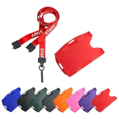 Made from soft nylon ribbon and printed doubel sided in white with Staff Lanyard These are printed Staff lanyards and comes in various colours, the lanyard will hang approx 18 inches and comes with a matching colour double sided id card holder Each Staff Lanyard has a built in Safety Breakaway Clips so if pulled these will break. Each Staff Lanyard comes with a double ID Card Holder which will hold to cards one each side of the holder size 86 x 54mm sames size as a credit card The card holder can be used in landscape of portrait orientation.