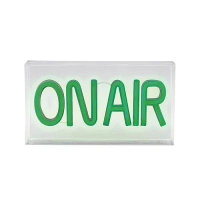 AmazonFreestanding USB Powered Green Neon Effect "ON AIR" Style LED Lamp in Clear Perspex Boxed Casing Precision Cut and Placed Diffuse Green LED Strips Recreate Neon Effect in this Boxed Lamp Designed for Indoor Use Only, this Light is Sure to Tell Others You're Busy and Makes a Great Mood Lamp Powered by Attached USB Cable that Requires a 5 V | 1 A Power Supply Adaptor (Not Included) Measures Around 23 cm x 12.5 cm x 4 cm and has a Freestanding Design for Placement on Flat Surfaces