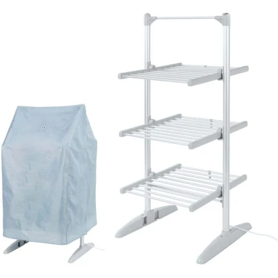 Folding Indoor 3 Tier Compact Electric Heated Clothes Airer with Cover included The Rediffusion RED248 Compact 3-Tier Heated Clothes Airer with Cover is a space-saving solution for efficient indoor drying, featuring a vertical design made from durable aluminum with 30 heating tubes and 14 meters of drying space, capable of holding up to 24kg of laundry. It heats up to 45-55°C in just 5-10 minutes and operates at an energy-efficient 248W, helping to reduce electricity costs compared to traditional dryers. With a 1.8m power cable and IPX1 water resistance rating, it’s both practical and reliable. The adjustable tiers can be fully opened or half-folded and fold neatly for easy storage when not in use. It includes a machine-washable polyester cover with vent holes for improved airflow, which doubles as a storage bag for the airer when folded, adding convenience to its compact, user-friendly design. Compact Design: Vertical layout with 30 heating tubes and 14m of drying space, holding up