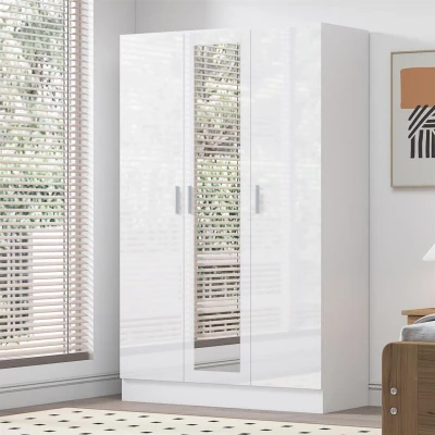 Elevate your bedroom with stylish, affordable storage. The Reflect High Gloss 3-Door Mirrored Wardrobe combines modern aesthetics with everyday practicality. Its sleek, minimalist design and high gloss finish make it a perfect addition to any contemporary bedroom setup. Key Features: High Gloss Finish: Sleek and reflective doors create a clean, modern look. Mirrored Door: Features one mirrored door for added convenience, paired with two plain doors for a balanced design. Durable Construction: Built from high-quality composite materials with a matt-finish carcass and glossy veneer doors. Soft-Close Mechanism: Ensures smooth, quiet access to your belongings. Ample Storage: Includes a full-width hanging rail and four additional shelves for organised storage. Easy Self-Assembly: Comes flat-packed with clear instructions and all necessary hardware. Ultra-Durable Melamine Veneer: Scratch-resistant and easy to clean for long-term durability. Approximate Dimensions: Height: 180cm Width: 113cm
