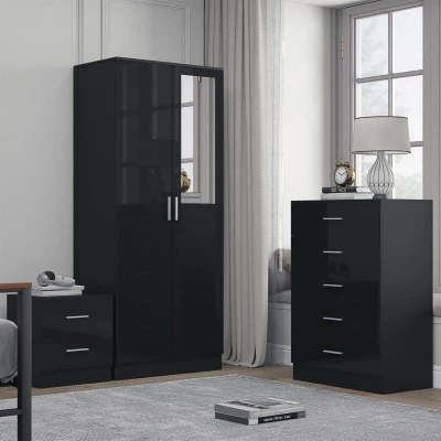 REFLECT Bedroom Furniture Set - 2 Door Mirrored Wardrobe + 5 Drawer Chest + 2 Drawer Bedside REFLECT combines style and practicality with modern furniture designed to elevate your bedroom. This set features a sleek 2 Door Mirrored Wardrobe , a stylish 5 Drawer Chest , and a compact 2 Drawer Bedside , all with a high gloss finish. Key Features: 2 Door Mirrored Wardrobe Elegant Mirrored Doors: Adds brightness and spaciousness to your bedroom. Soft-Close Mechanism: Smooth and quiet operation. Durable Build: Crafted from high-quality composite materials with melamine veneer. Ample Storage: Includes shelving and hanging rails for versatile storage. Approximate Dimensions: Height: 180cm × Width: 76cm × Depth: 47cm 5 Drawer Chest Stylish Storage: Multiple drawers for efficient organization. High Gloss Finish: Sleek and elegant look. Durable Build: Crafted from quality materials. Approximate Dimensions: Height: 100cm × Width: 70cm × Depth: 40cm 2 Drawer Bedside Compact & Functional: Ideal for