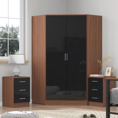 Reflect 3pc Wardrobe Bundle 2 Door Corner + 2x 3 Drawer Bedsides Black Gloss & Walnut