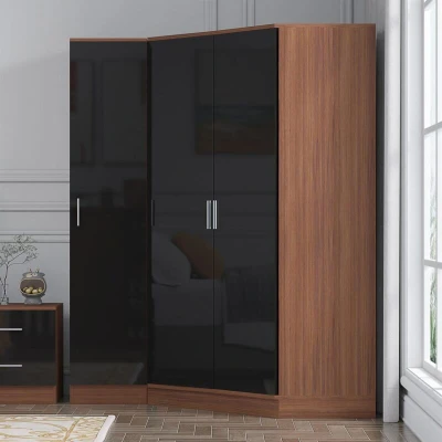 Reflect Bedroom Furniture 2 Door CORNER Wardrobe + 1 PLAIN in Gloss Black/Walnut