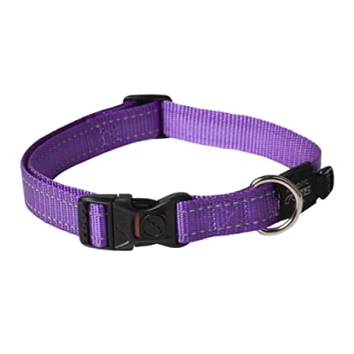Large Reflective Purple Dog Collar: 3/4" wide, Adjusts 13-22" Matching Leash and Harnesses are available Available in Black, Blue, Red, Orange, Purple, Turquoise, Yellow, Chocolate, Pink and Lime Green The 3/4-inch Fanbelt collar adjusts for a neck size of 13-inch to 22-inch; Suitable for Dalmation, Spaniel, Doberman, Boxer and similar sized breeds Lockable Buckle and Unique Design to remove the load on the Buckle and place it directly on the D-Ring